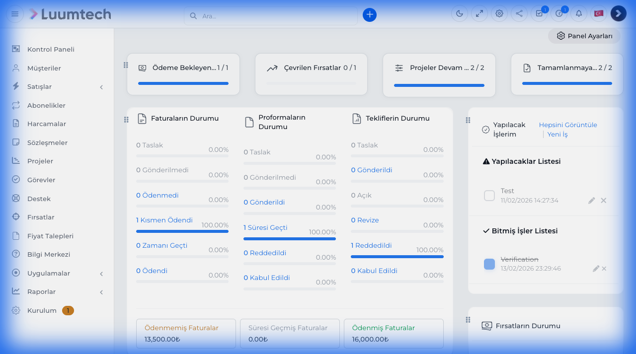 Dashboard, CRM sisteminizin kalbidir. Giriş yaptığınızda karşınıza çıkan ilk ekrandır ve işletmenizin genel durumunu tek bakışta görmenizi sağlar.