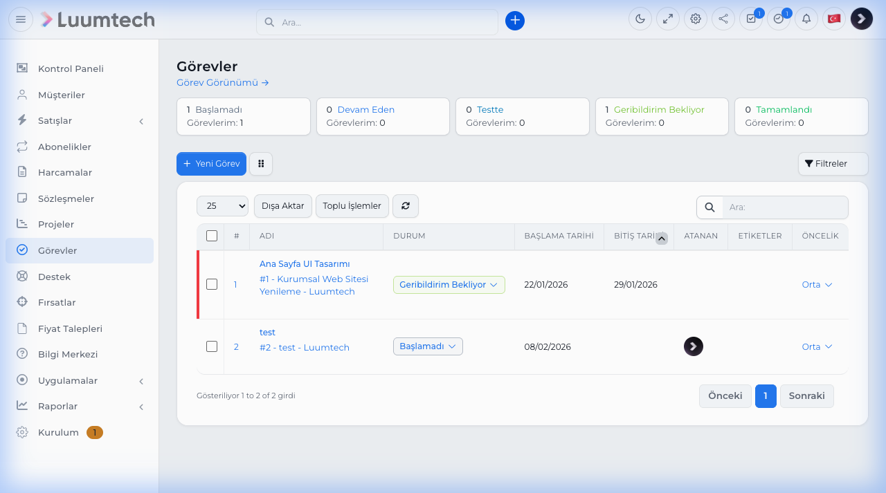 Luumtech CRM'de görev yönetimi, ekip çalışmasını organize etmenizi, süreleri takip etmenizi ve görevleri faturaya dönüştürmenizi sağlar. Görevler projelere, müşterilere veya diğer modüllere bağlanabilir.